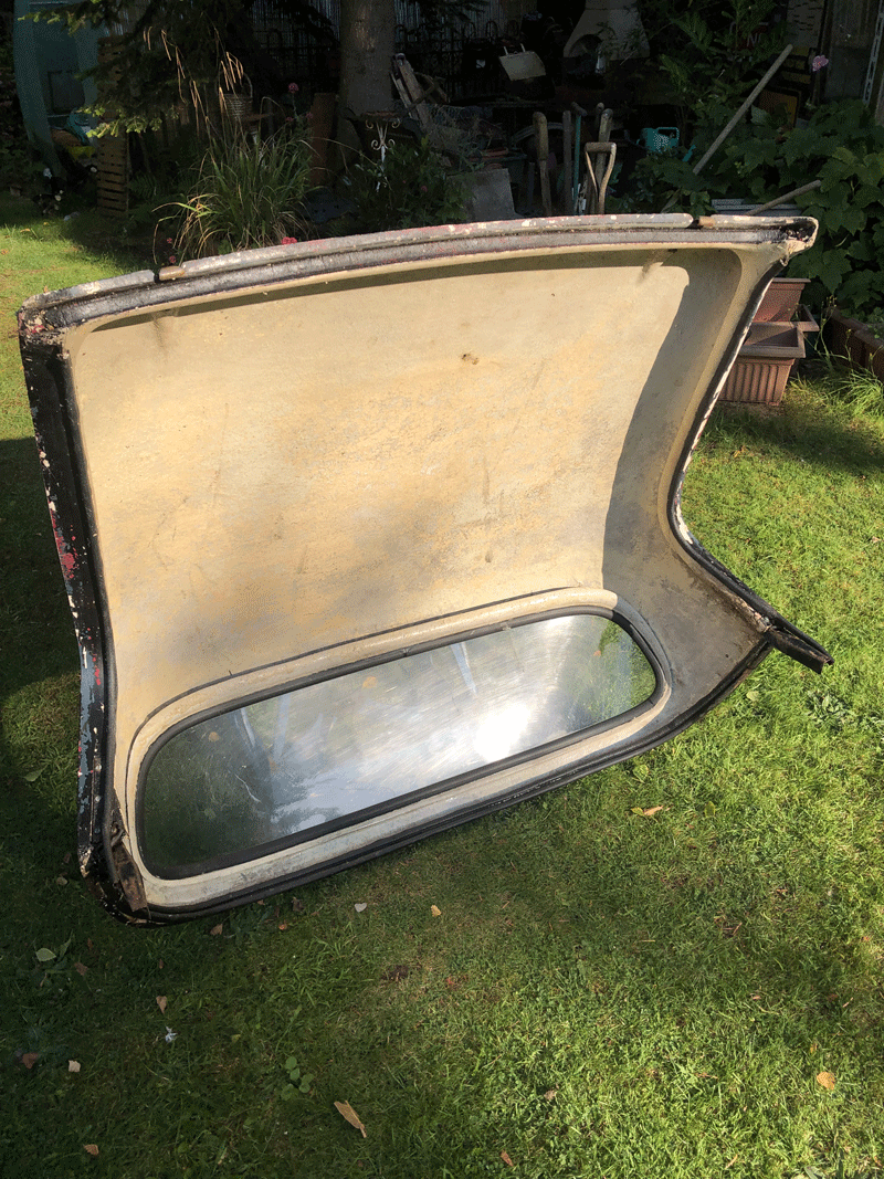 " I have for sale a DHMC hard top, it is in need of restoration but this is not beyond the skill sets of Sprite owners, the top will need to be stripped (having been brush painted) back to the original gel coat and some GRP repair is needed across the top edge of the rear screen. There are no side screens but it does have the original wing nut fixings. Please come and look before buying, I am in Girton,Cambridge. I am open to offers and can send more pictures if needed".