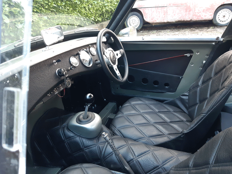 Based on a 1963 Austin Healey Sprite, now fully restored, with steel body and rear end plus an Archers fibreglass bonnet and hardtop, painted in California sage green. Fitted with a 950cc engine bored out to +60 fitted with flat top pistons on later fully floating lightened and balanced con rods. Brand new nos crankshaft (std/std). Uprated camshaft (CA4), 206 casting cylinder head with tubular exhaust manifold with side exit, running H4 SU carbs on Healey manifold. Standard gearbox with new type oil seal conversion, lightened flywheel with 9 spring type clutch. Full bolt in roll cage with removable door side bars (not currently fitted). Front with lowered and stiffer road springs, rear has 1/4 elliptic with rare Armstrong adjustable shock absorbers. Alloy radiator with electric cooling fan. Looking for