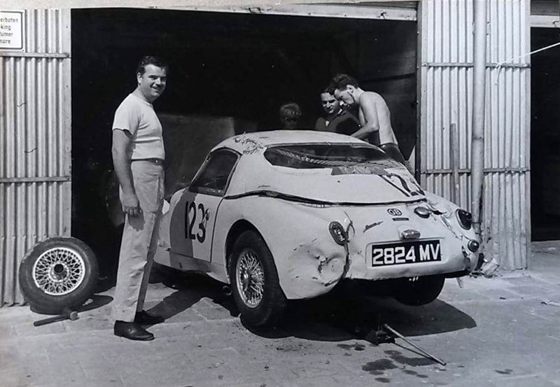 Built in June 1959, 2824 MV was purchased new by Rolls-Royce dealer Danny Margulies who, like his friend John Sprinzel, traded from mews premises in London's West End. He competed with the car in three international rallies: The first was, with J.Campbell-Jones navigating, on the 1960 Alpine Rally and the second in that year's Liege-Rome-Liege with Stuart Turner, unfortunately failing to finish in either event.The car was entered by American Lotus distributor, Jay Chamberlain, at the Nurburgring in 1961. Unfortunately he rolled the car in practice (see photo 3, right). Bryan Allart tells us "it shows Jay Chamberlain in the foreground, myself attempting to get the car into some sort of race worthy condition, while Dan Margulies casts a watchful eye in the background. The editorial states (now amended) that Richard Melville was probably driving the car at the time. That is not so. Jay Chamberlain was at the wheel and claimed the roll was due to a blown front tyre. That also is incorrect!".