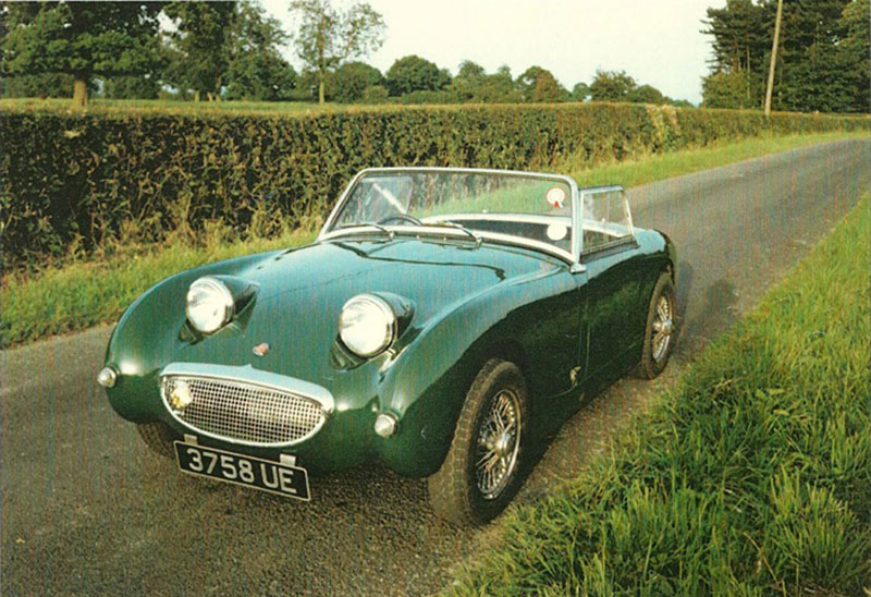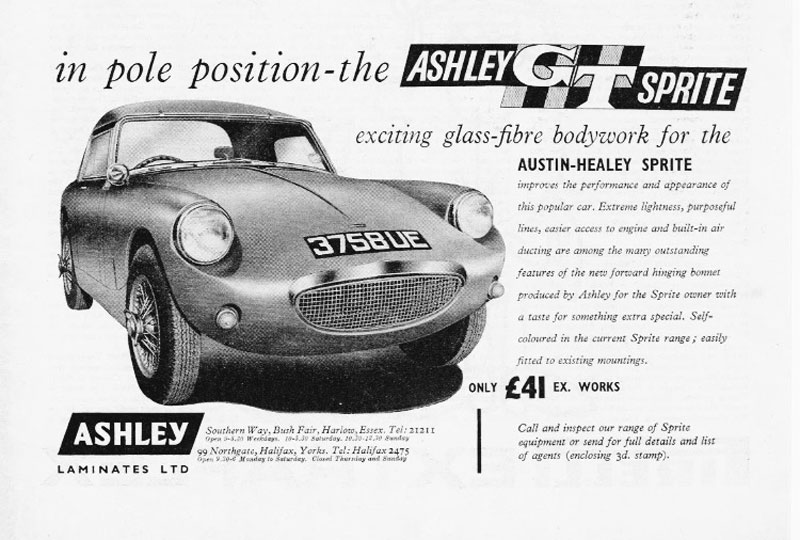 "3758 UE was displayed on the Ashley stand at the 1960 Sports Car Show and then used in contemporary adverts for Ashley. In the 1990s I tried and succeeded in tracing this car. As can be seen in the [colour] photo (right) taken in 1999 the Sprite had lost the Ashley bonnet and hardtop. The then owner of the car had no knowledge of its history, even though he had owned the car since 1978. The Sprite was equipped with the complete Girling brake set-up, hence the wire wheels. It, therefore, can be classified as a Sebring Sprite. I can only speculate that the car was prepared by the Donald Healey Motor Company at The Cape, hence the Warwick registration, to Sebring spec. for Ashley Laminates for the 1960 Sports Car Show. I had hoped to buy this car but the owner part exchanged it for a Jensen Interceptor through a dealer in Cheshire. The car has since 'disappeared', unless someone out there knows of its whereabouts".