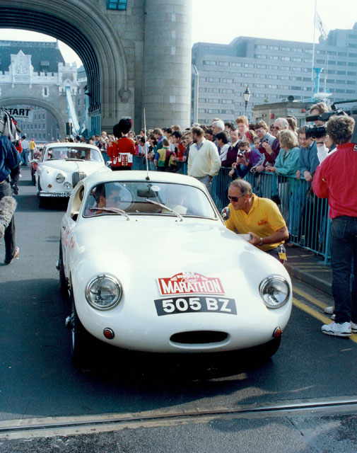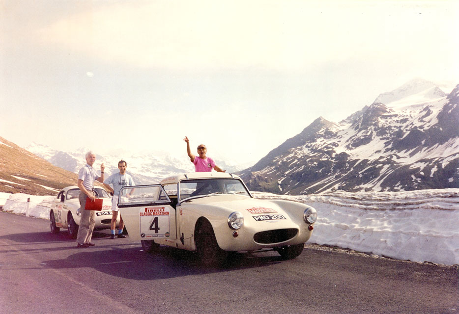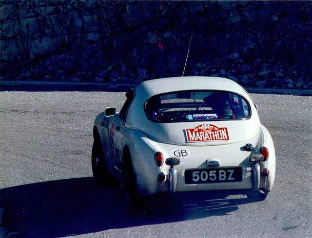 The newly restored Sprite, using a later Midget engine, was again entered for every possible event, from autotests to racing, and gave its new guardian a tremendous amount of fun and some success including several class wins on the Irish Circuit Retro. A genuine Formula Junior short engine, in conjunction with an alloy Speedwell cylinder head, was developed for use on historic international events, beginning with the 1990 Pirelli Classic Marathon, and progressing to the Corse Retro 40, an event voted the toughest historic rally of 1996. Perhaps the most nostalgic success from this period was joining up with John Sprinzel and Willie Cave to form Team Sprinzel Sprite on the 1991 Marathon, when, navigated by Michael Beattie, 505 BZ was part of the winning the team.