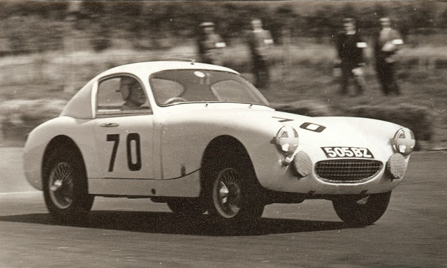 The under-hung and inverted rear springs were changed back to their standard position to give extra ground clearance for rallying, as can be seen by comparing the two racing pictures. The original aluminium bonnet, of a design also by then available to the buying public from Speedwell in glass fibre as ‘The Monza’, went on to have a life of its own fitted to the Frogeye of Adrian’s next younger brother, Derek. That Sprite (888 CZ), with the alloy bonnet still fitted, later passed to John Watson who developed it for racing, thus sowing the seeds of his subsequent competition career.