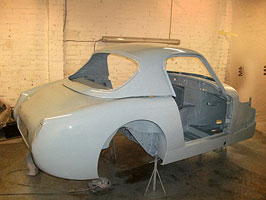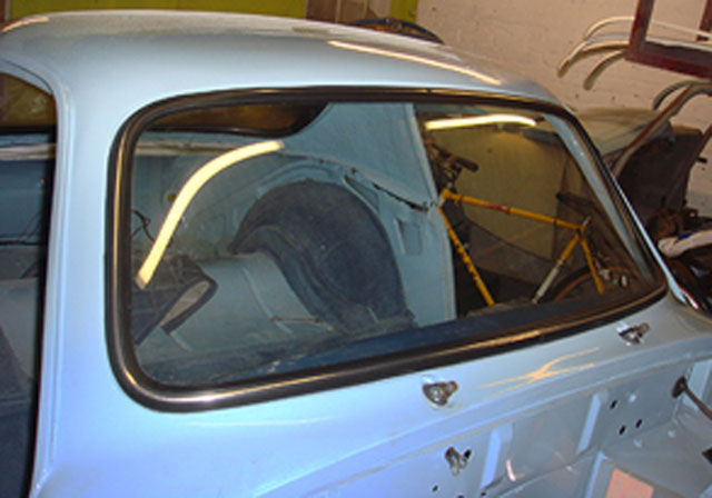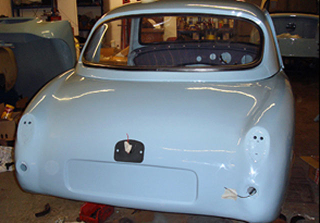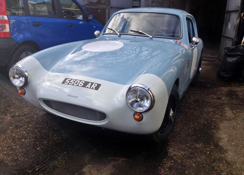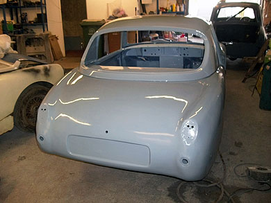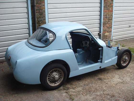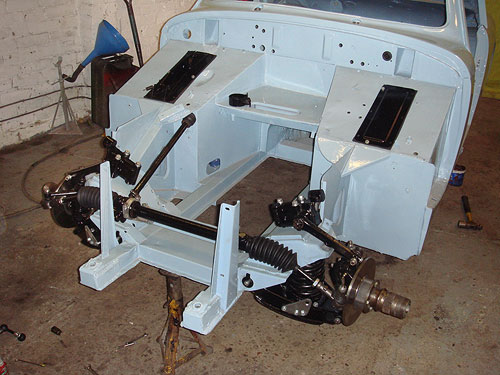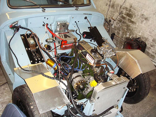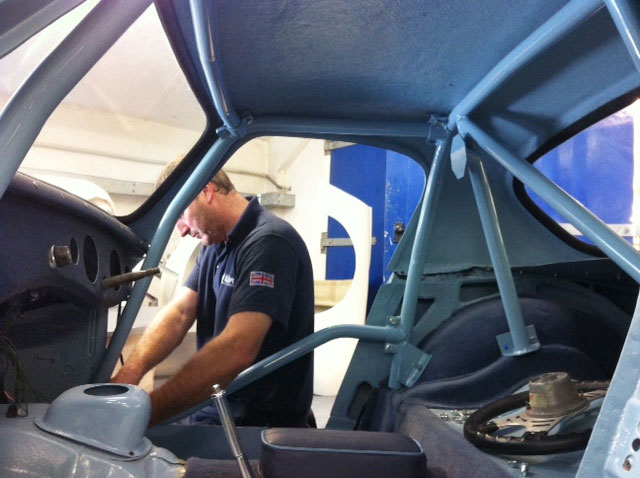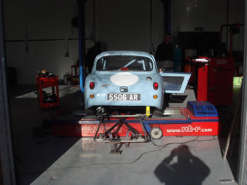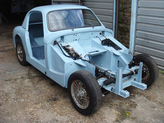 After being stripped to bare metal and sand-blasted the shell was fitted with new floors, floor strengtheners, sills, front inner wing assemblies etc. Then it was fitted with the Archers coupe top and bonnet. It has 4" wheels for road use and 5" for competition, the latter with Dunlop CR65 x 450 L section track only tyres for HRDC, and