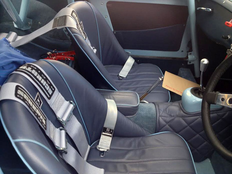 The Sebring uses an Archers' body kit, Peter May 1380cc ¾ race spec engine using a softer Piper 286 cam, 1275 straight cut close ratio gearbox, CCK full roll cage. Its colour is Speedwell Blue with Old English White dipped nose - his son's choice, being his boarding house team colours influenced by James Hunt having his helmet painted in his school colours.