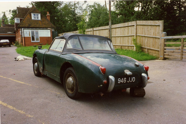 I bought JJO in July 1988 from a guy in Brighton. It was advertised as needing restoration ~ which it certainly did. The rear suspension had collapsed on one side, the bodyshell was in a very distressed condition and it had a cracked and broken fibreglass bonnet. It was one of several Sprites and Midgets I acquired at a time when I was keen to change career and thought of going into car restoration. A bit of a mid-life crisis I suppose. That never happened but at the end of it I was left with the rather forlorn-looking JJO.