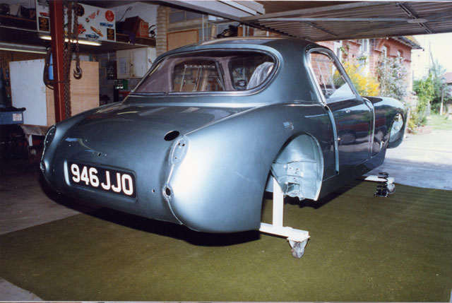 The front half of the chassis was in reasonable condition compared with the rear which had to almost entirely replaced with new metal. I had a couple of rear wings which Brian found he had to lengthen, and found another rear shroud as JJO's had been badly dented. Eventually the day dawned when the Coupé could be put in position and it was at this point I made a trip up to see its progress. Remember at this point no replica Sebrings had been produced though Brian had sold a kit to John Morgan who was having one assembled by Country Lane Classics (this now the Andy Actman car). It was very exciting to see the long-awaited project finally coming together and with an end in sight. next would be the painting and I chose a colour which I thought resembled the Aston Martin green used on DB4s and the like ~ Ford Aqua Jade.