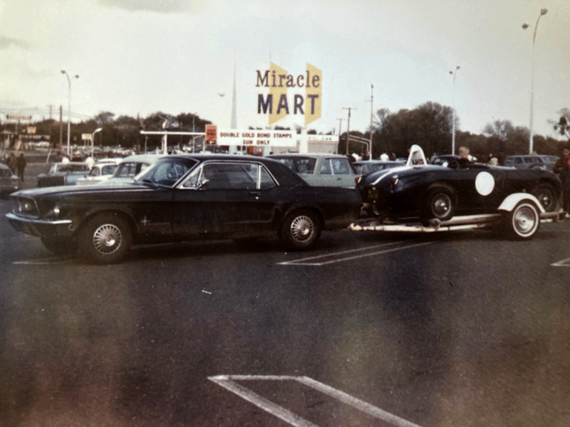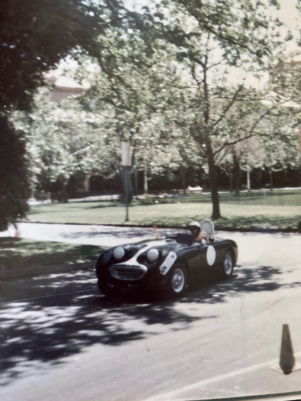 Reid tells me : "I did receive old photos of the car, taken in the late sixties, showing it in a different livery of dark blue with white center stripe, white rollbar, and white number roundels". See photos below: