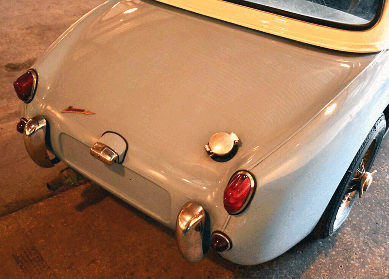 The car has the 8” rear drums, along with the correct 60 spoke wire wheels, but was fitted with the Lockheed Thin Disc front brakes rather than the more usual Girling Type 10s. The car is now back in it’s original shade of Iris Blue. |