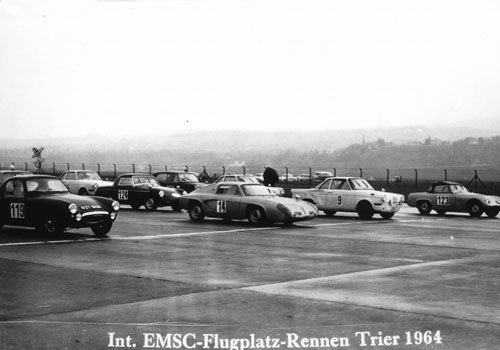 Of the 6 Williams & Pritchard bodied Sprinzel Coupes believed to have been built, two of them have disappeared. This one was originally registered WJB 727 but on being purchased by (the late) David Seigle-Morris it was re-registered with his personal plate, D20, and raced and rallied very successfully by him during 1961. It was one of a three car team raced by John Sprinzel Ltd. Like several of the others it was painted steel grey but with fully trimmed interior and David's car was part of the victorious 6 hr relay team at Silverstone and the 500 km team win at the Nurburgring. David then joined the Ford works team driving Lotus Cortinas and the Sebring Coupe was sold to Roger Mac for 1962 , - now with the registration 627 SKN - and he used the car for hill-climbing. When Tom Coulthard was researching his , and Sprinzel's, book "Spritely Years" in the early 1990's he was unable to discover what happened to the car thereafter. However, a recent email received from Kai von Schauroth who races his own Sebring (replica) in Germany, reveals how the missing car was raced in Germany during 1964. Frank Kalkuhl, who is now 80 years old, drove the car at the time and has supplied a number of fascinating photos of the car at Flugplatz-Trier (opposite).