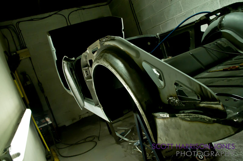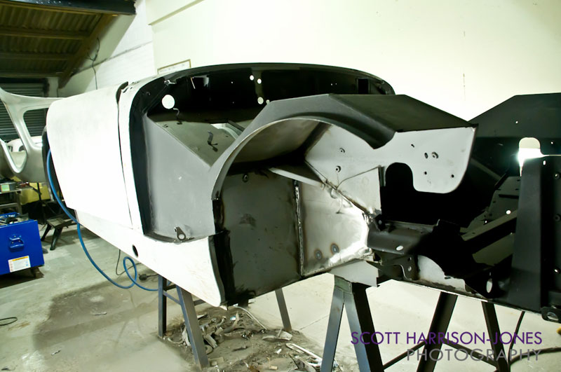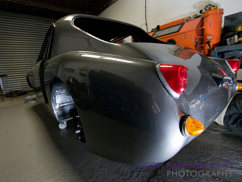 He explains: "It was in a poorly state but not beyond repair so it was stripped, shot-blasted and then oxy-primed and baked. Then we went to work on replacing the rot, fitting a new floor, rear bulkhead, boot floor, and strengthening it as we went along. Once it had been trial-fitted with the fastback body, doors and bonnet, the roll-cage was fitted, fully welded but still bolted-in. The colour for the new car was chosen being Jag Gun-metal grey, and the paint shop did a stunning job as they had just done Sir Stirling Moss's XK120 ~ so can be recommended. After the painting the engine and box were fully re-built and we moved on to the diff and axle. All parts have undergone shot-blasting first, then either painted, powder-coated or electro-plated. All bushes, bearing and seals have been changed, and the suspension re-newed with the exception of the rear springs. The front suspension has retained the original king pins and springs, but everything else was replaced. The engine is a 1275 ~ not the original to the car as numbers don’t correspond but it has undergone a rebuild. The gearbox has been also been fully rebuilt with new syncro's, bearings and layshaft. Wheels were shot blasted and powder- coated with new tyres and spinners. With a new master cylinder fitted the brakes were soon working, with new discs and calipers.