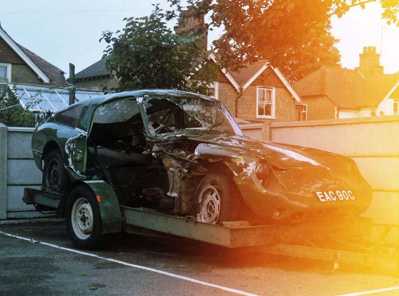 Dudley Lucas takes up the story: "I bought the car as raced but fitted with Dunlop SP tyres on a very good-looking set of magnesium alloy wheels from which the much less attractive Healey wheels were copied. It was fitted with the 1293cc dry sump engine and 4 speed gearbox. EAC did many UK club events, being part of the winning Sprite team in the 1967 6 Hour Relay and 1968 4 Hour Relay. It was also used on at least one occasion before it came into my possession because I was recently shown a photo of the car in pole position, next to John Willetts in the Sebring car, at Oulton Park and I have no recollection of this event at all - it would be nice to find out more*. The 1970 Mugello race crash was preceded by an attempt to sabotage the car. The day before the event Arthur was invited to move lodgings by some people attending the event, which he did. Then on the first lap he noticed the water temperature rise alarmingly, which had never happened before, and stopped at the pits to investigate. The radiator was empty, further scrutiny revealed that the Jubilee clip securing the bottom hose to it had been undone and was now hanging loose. The Sprite was hardly a threat to the big cars but would have stood a good chance in the class. Anyway the Abarth driver put paid to that. The car was broken up and the undamaged parts sold off although the unfortunate new owner of the gearbox had trouble with it as the force of the accident had distorted one or more of the shafts. The body went to a local scrapyard. I have in my possession numerous photos of the car, also the Healey works specifications, and several sheets of details which Geoff Healey gave me when I collected it. Hope this provides a more accurate history of EAC, ~ had it not been for that Italian moron I would still have the car today..."