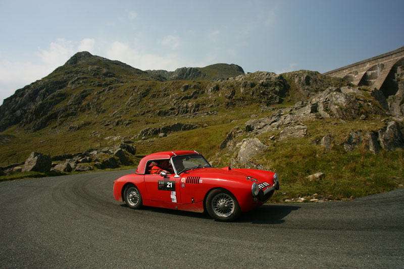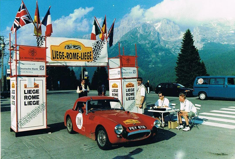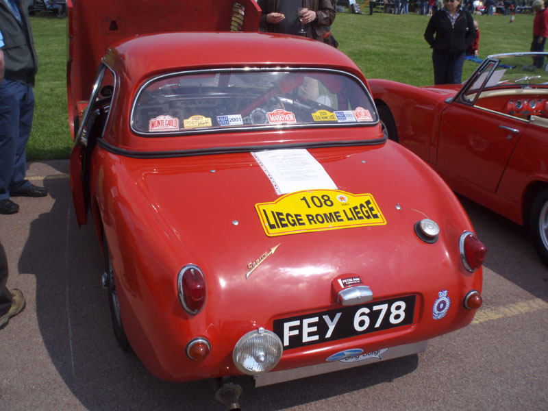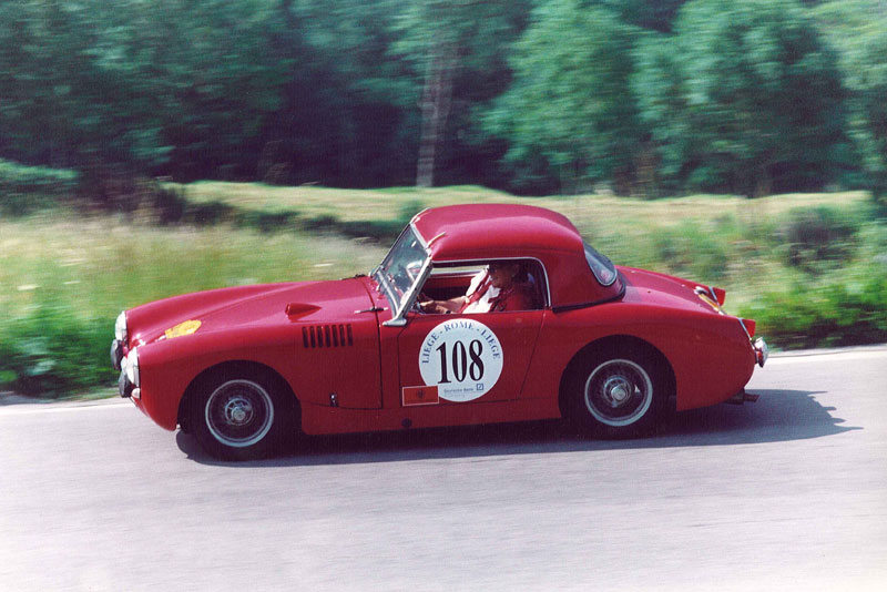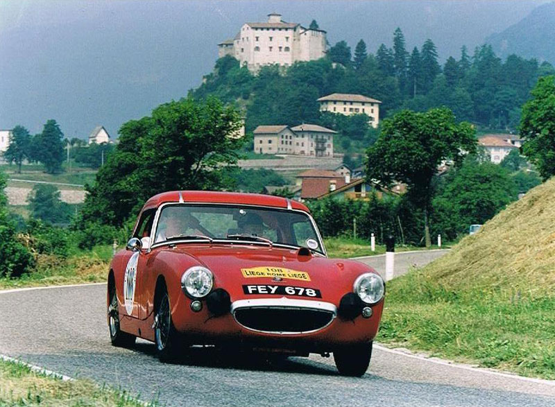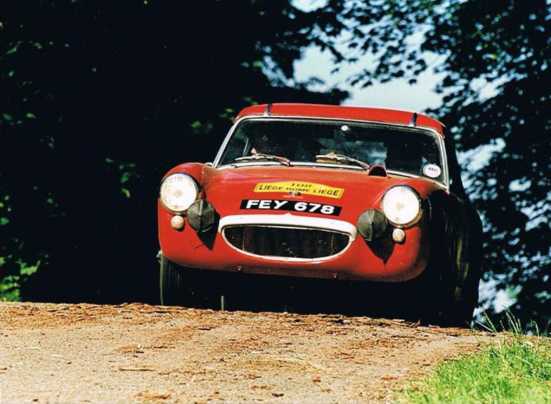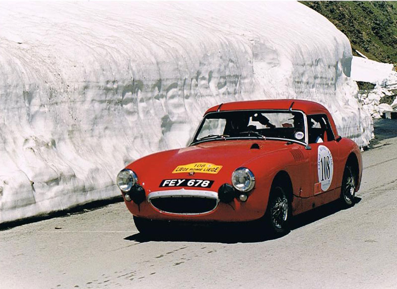 Alex bought the car in 1990 in a very derelict state. Martin Coxhead rebuilt it to standard specification and it was in that form that Mike Creasey and his son took part in the 1990 Monte. Alex was unable to take part due to business commitments. The car was in a pretty poor state when it came back – road salt had wreaked havoc so he then carried out a second rebuild to create a Bonneville Sprite but with the steel bonnet. John Sprinzel originally developed and homologated the Bonneville version of the Sprite in the '60's, equipped with a Shorrock supercharger, disc brakes and wire wheels. It was in this form, with a white hardtop that Alex, with his wife Jane as navigator did the 1999 Monte. That created the need for its third rebuild when it gained its Sebring front and the Peter May engine. It is 962 cc, fitted with Shorrock C75b supercharger, producing 80 bhp, and has a smooth-case gearbox with ST straight cuts gears, a 4.4:1 diff, wire wheels, Lockheed discs, and Peter May rear axle internals. The bonnet and seats are from Archers and the hardtop is a standard pruduction one. The car weighs in at 600 kg - top speed 95 mph, 0 - 60 mph - 9.5 secs.