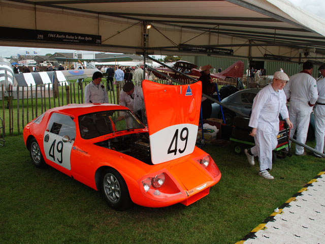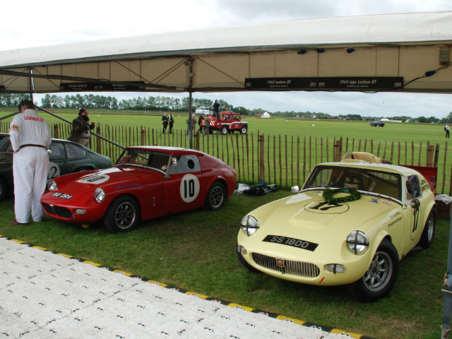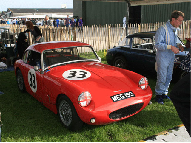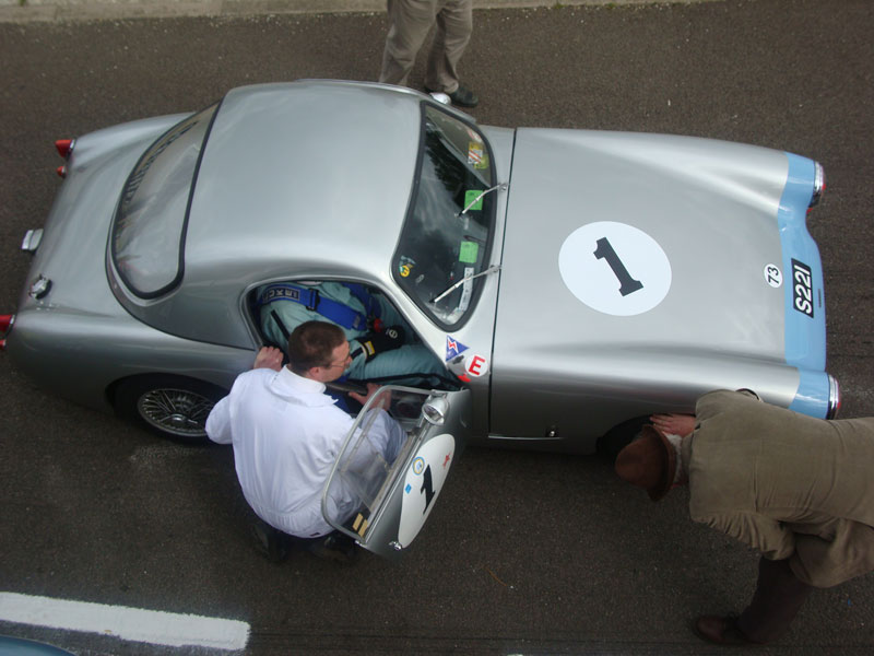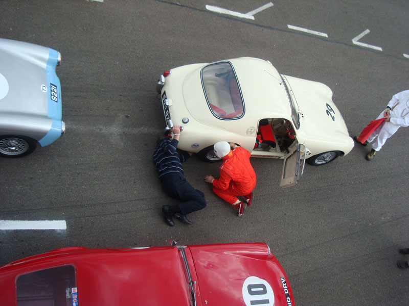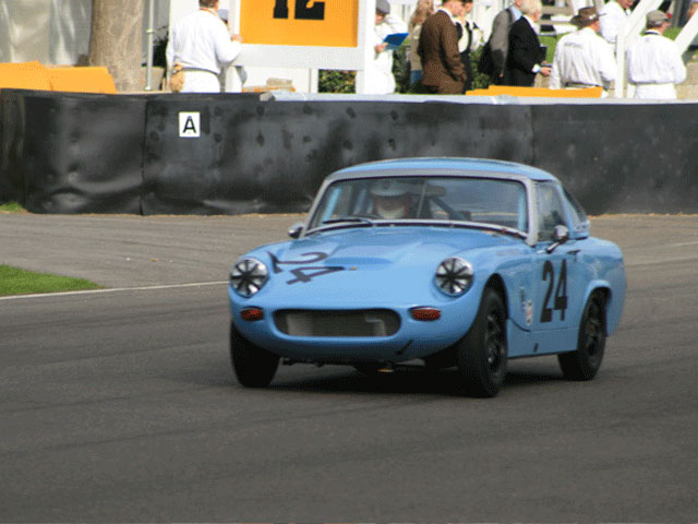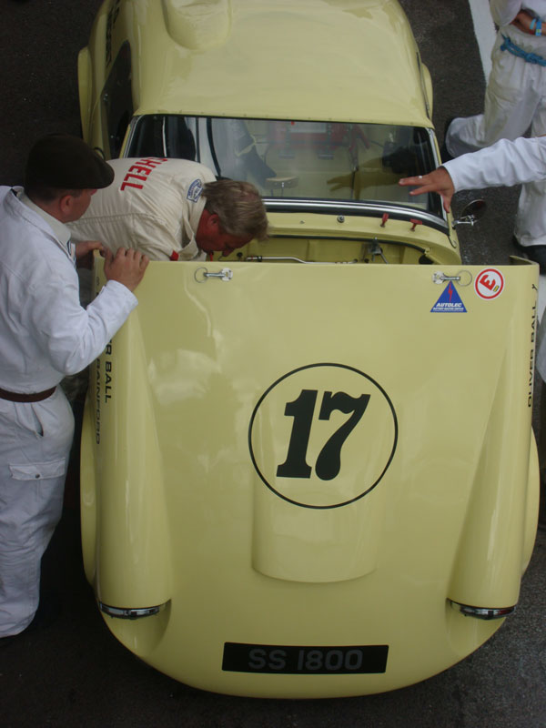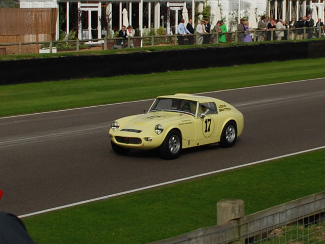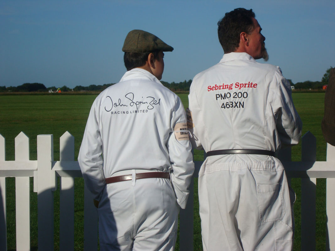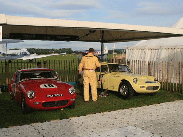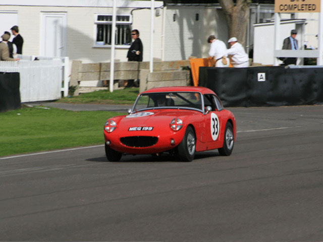 My planned convoy of Sprites to the Goodwood Revival didn't quite materialise as Stephen Bowen took his ex-Ian Walker car, WJB 707, direct to the circuit on the Friday accompanied by Michael Meerlo with his newly completed Sebring Fastback replica. We were therefore down to Susan and I in JJO accompanied by Ralph Whitmarsh in his Frogeye. It was a lovely morning so we stopped briefly on Ashdown Forest to take photos and arrived at Goodwood just an hour before the "big race", the Fordwater Trophy. The grid (see below) included seventeen very special Sprites, if you include James Willis's MG Midget Coupé. On the front row were Nick Swift in the rather strange-looking Mini Dart, Rae Davis in his MiniJem and Gordon Elwell in Meg (MEG 199 Sebring Sprite). Shaun Rainford was on Row 2 in his replica of John Britten's SS1800 Lenham GT alongside Richard Mein's pretty little Deep Sanderson. On the 3rd row were Antonio Bertini (Speedwell GT), Paul Woolmer (BXN) and James Willis's Midget. Sadly after weaving his way round the warm-up lap to heart up his tyres James' transmission gave up, leaving him without a race. On Row 4 were Mike Haigh's Lenham Le Mans, alongside Julius Thurgood's so-called Ashley GT. David Wylie was a welcome sight in the middle of Row 5 with his Speedwell ~ invited very late in the day. Behind him were the WSMs of Brian Arculus and Ivor Miller, and on Row 7 was Dick Skipworth's re-creation of the Ecurie Ecosse Sprite. Chris Clegg was on Row 8 with S221, and Clive Cocks's WSM was on Row 9. David Stubbings red Lenham GT was just behind and Martin Davidson in 7080AC on Row 11, having had problems with its rebuilt overdrive unit in practice. Neil Hardy brought out the blue Speedwell for the first time, but Tony Wilson-Spratt's WSM MGB failed to complete the warm-up lap. Jim Prentice's Le Mans Sprite doesn't appear on either the qualification sheet or the grid but somehow finished 8th in the race!? [I have since learned that the car's condenser failed between paddock and the collecting ring for practice. However as he had raced at Goodwood the year before the Stewards allowed him to start, ~ at the back of the grid ( MEI, Nov 2011)].