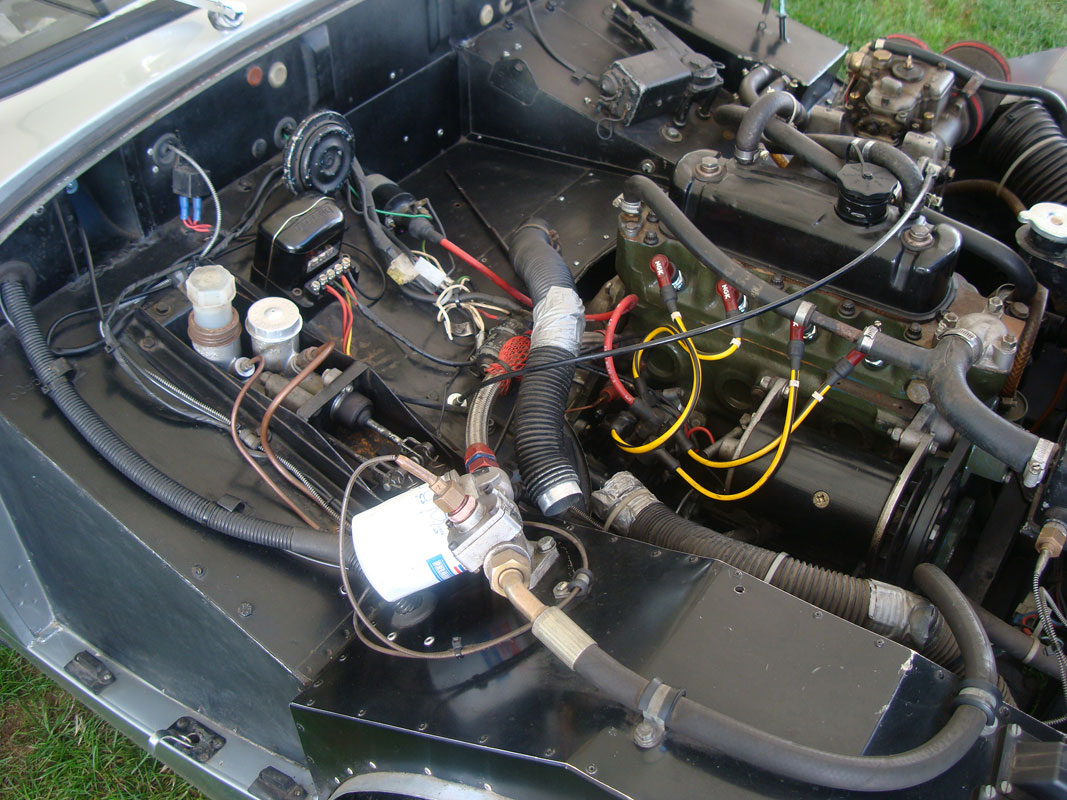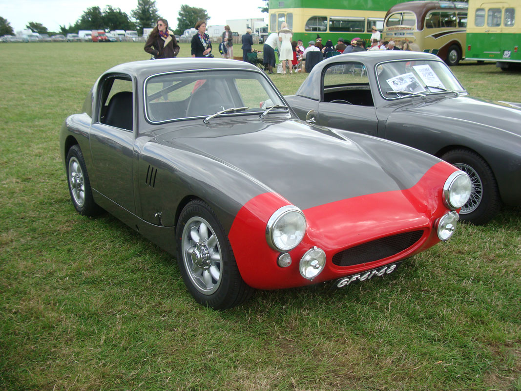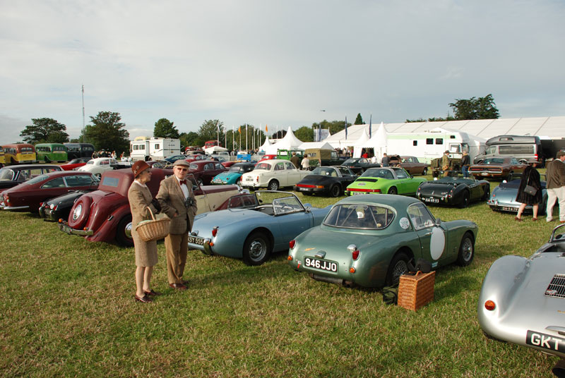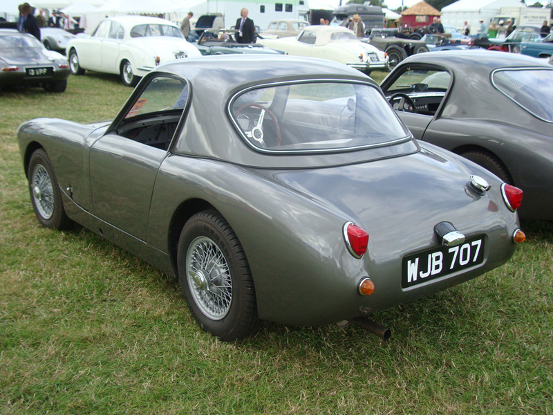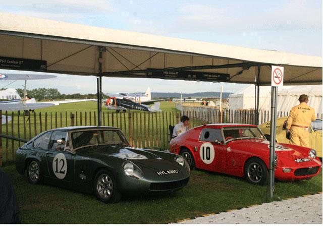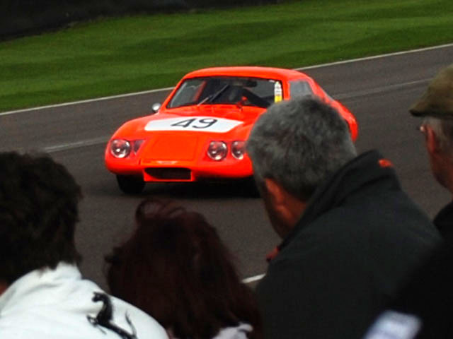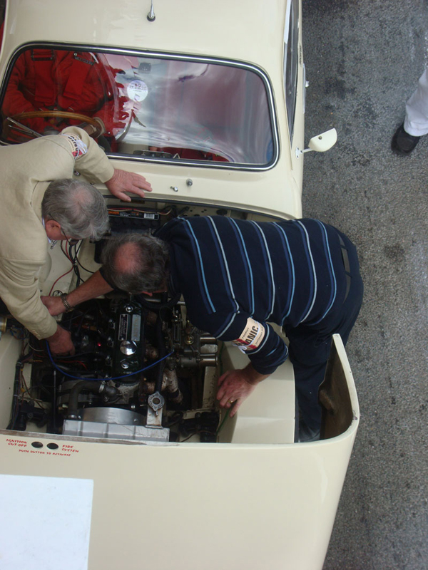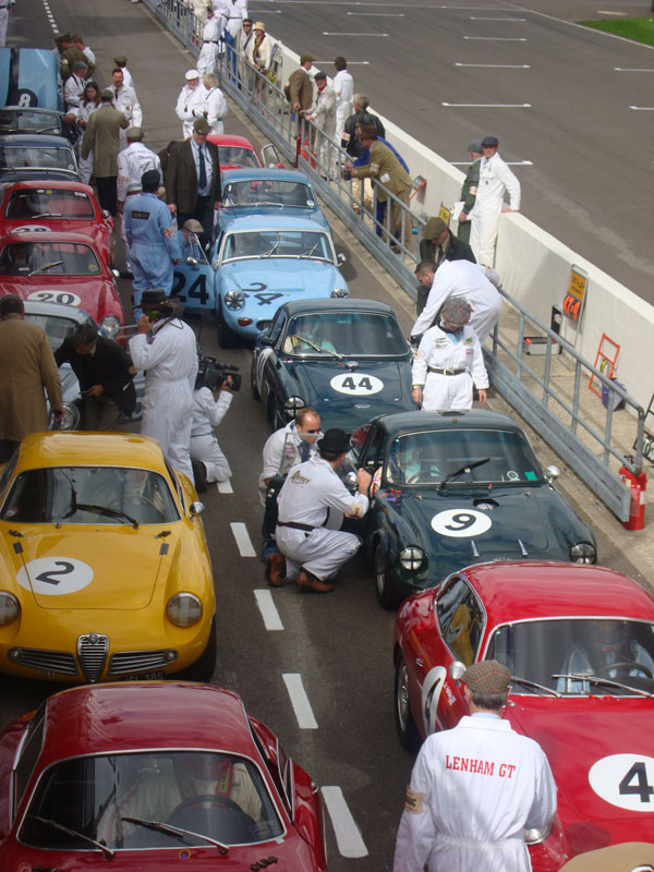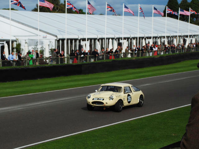 My planned convoy of Sprites to the Goodwood Revival didn't quite materialise as Stephen Bowen took his ex-Ian Walker car, WJB 707, direct to the circuit on the Friday accompanied by Michael Meerlo with his newly completed Sebring Fastback replica. We were therefore down to Susan and I in JJO accompanied by Ralph Whitmarsh in his Frogeye. It was a lovely morning so we stopped briefly on Ashdown Forest to take photos and arrived at Goodwood just an hour before the "big race", the Fordwater Trophy. The grid (see below) included seventeen very special Sprites, if you include James Willis's MG Midget Coupé. On the front row were Nick Swift in the rather strange-looking Mini Dart, Rae Davis in his MiniJem and Gordon Elwell in Meg (MEG 199 Sebring Sprite). Shaun Rainford was on Row 2 in his replica of John Britten's SS1800 Lenham GT alongside Richard Mein's pretty little Deep Sanderson. On the 3rd row were Antonio Bertini (Speedwell GT), Paul Woolmer (BXN) and James Willis's Midget. Sadly after weaving his way round the warm-up lap to heart up his tyres James' transmission gave up, leaving him without a race. On Row 4 were Mike Haigh's Lenham Le Mans, alongside Julius Thurgood's so-called Ashley GT. David Wylie was a welcome sight in the middle of Row 5 with his Speedwell ~ invited very late in the day. Behind him were the WSMs of Brian Arculus and Ivor Miller, and on Row 7 was Dick Skipworth's re-creation of the Ecurie Ecosse Sprite. Chris Clegg was on Row 8 with S221, and Clive Cocks's WSM was on Row 9. David Stubbings red Lenham GT was just behind and Martin Davidson in 7080AC on Row 11, having had problems with its rebuilt overdrive unit in practice. Neil Hardy brought out the blue Speedwell for the first time, but Tony Wilson-Spratt's WSM MGB failed to complete the warm-up lap. Jim Prentice's Le Mans Sprite doesn't appear on either the qualification sheet or the grid but somehow finished 8th in the race!? [I have since learned that the car's condenser failed between paddock and the collecting ring for practice. However as he had raced at Goodwood the year before the Stewards allowed him to start, ~ at the back of the grid ( MEI, Nov 2011)].