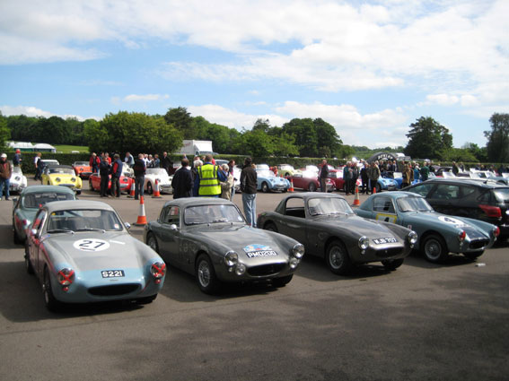 Friday 16th May dawned overcast, dull and cold with the ever-present threat of rain, but this did not daunt the spirits of the great many Healey enthusiasts who made their way to the Goodwood race circuit in Sussex. When Susan and I arrived in JJO at 8.15 the paddock was already busy with Healeys of all shapes and sizes, from Nash-Healeys to Silverstones, Elliotts, 100s, 3000s but predominantly Sprites including Frogs, and Marks 2,3, and 4. For me, of course, the historic Sprites were what I had come to see, and the fact that this was to be the first time 4 of the famous Sprinzel Coupés would be together in one place since 1961 made it very special. Paul Woolmer was on the organising team and had completed the restoration of his PMO200 back in 2006; Chris Clegg had been racing S221 at Silverstone the previous weekend but brought it along; 410EAO was now in absolutely pristine condition after its 18 year rebuild in the hands of Jonathan Whitehouse-Bird; and WJB 707 which Stephen Bowen has owned for 42 years, had finally emerged from Brian Wheeler's paint-shop just two weeks ago, enabling Stephen and his friend Michael to fit it up with glass, lights, suspension, steering and wheels, leaving the rest of the work to be completed before its intended trip to the Le Mans Classic in July. Many other special Sprites were present in the display tent including both versions of Jack Wheeler's 7080 AC. The streamlined one was another job recently completed by the amazing Brian Wheeler and it looked great - not to mention the very rare cross-flow head and twin Webers fitted to its motor. 4 HAC, the prototype aluminium bodied Sprite, very like the Targa Florio cars, but which never made production, was there, as were Bill White's Peel-bodied Sebring Coupé 52 LPH which he has owned for 40 years, re-creations of the EcurieEcosse Sprite, and Paddy Gaston's RAM 35, plus Paul Woolmer's newly-repaired 46 BXN which he had the misfortune to roll in the Goodwood Revival in 2006, now ready for its former owner and racer Peter Jackson to drive on Sunday. Douglas Wilson-Spratt (and son, Tony) was there with several of his gorgeous WSMs, Dave Owens' Lumbertubs Sprite, and Ian Grainger's ex-Clive Baker Sprite 2341UE etc, etc.