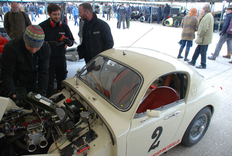 The sun was shining as I arrived at the Goodwood circuit on Saturday morning and the 100,000 daffodils which had been planted in the autumn were, by perfect timing, out in full bloom. I made straight for the Les Leston Cup camp where I found David Wylie's Speedwell GT, the Graham Robson WSM, Ian Burford's Tubby and Rae Davis' WSM being readied for practice. Above left is the very user-friendly programme and the earpiece from which I heard the commentary all weekend. |