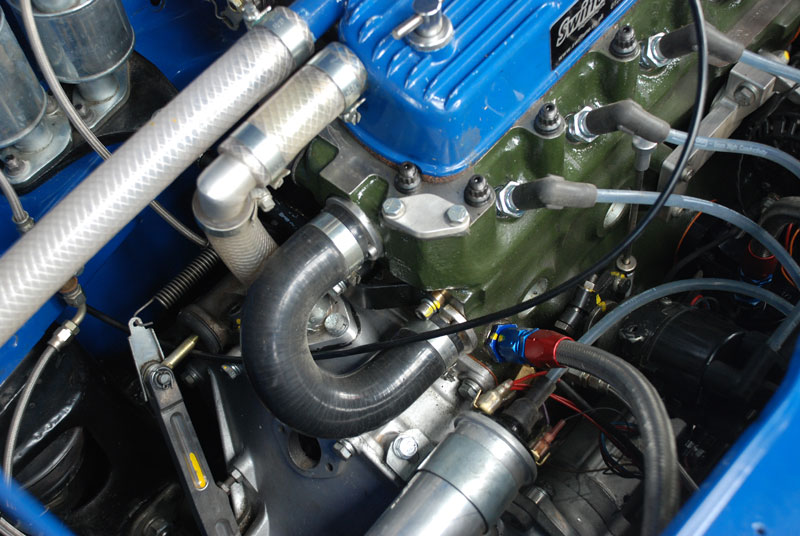 Work soon commenced on changing the Wylie head gasket. Note cast alloy channel on top of Speedwell's door - attention to detail in these cars was amazing. Underbonnet shot of the Lumbertubs Sprite, right. |
