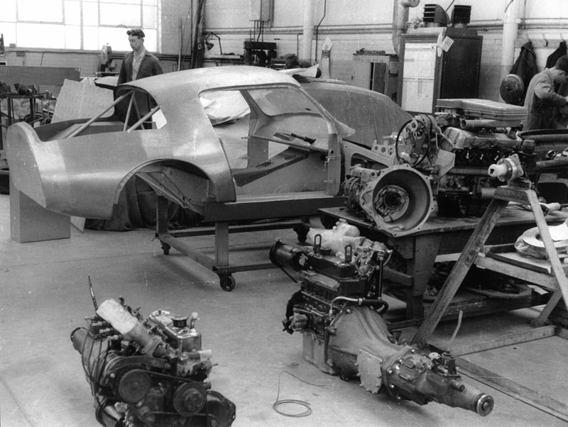 The Healey workshop, with probably chassis 238 under construction and 2 fuel-injected engines and 5 speed gearboxes on the floor.