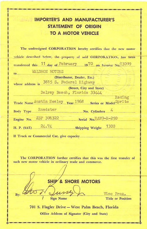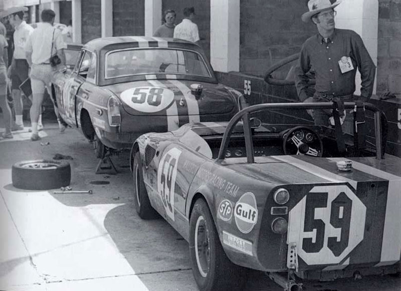 initially to Ed Bussey of Ship & Shore Motors from whom it went to Chris Waldron of Waldron Motors in Florida. Waldron entered it for the Sebring 12 Hours in March, 1970 where it was to be driven by Reggie Smith, Donley and Buttari. Rather ironically in the circumstances (it having been sold off by the Healeys when BMC support was withdrawn) it was entered as a BMC or, in some records, as an MG Midget! I notice they had already changed the steering wheel (perhaps wanting a smaller one). Unfortunately it managed only a couple of laps before retiring with a burned piston. It was later sold on to Bob Fine who raced it in a number of US events including the American Road Race of Champions, in 1973. It was still racing in 1977 (Texas World Speedway).
