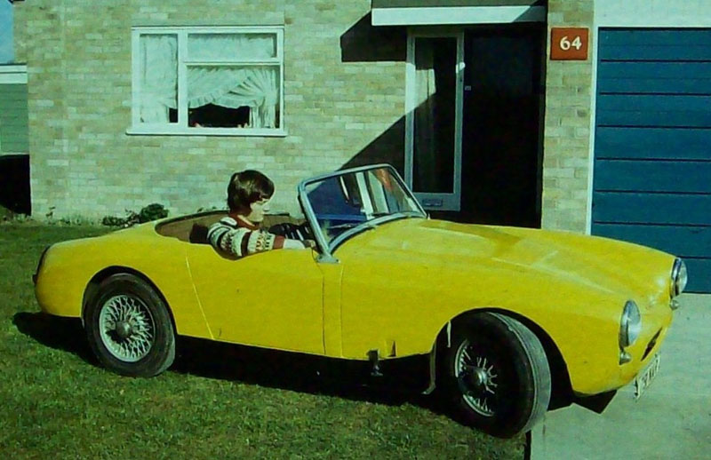 791 NAR was sitting outside a country garage at Catworth, on the old A14 between Huntingdon and Thrapston; having just been painted in a bright yellow and sporting a sign saying £150. The garage owner explained that he had just sprayed the car yellow as it had previously been a dull blue; "Not a very sporty colour" he told me..... This young man's heart was stolen and a deal was quickly done! The log book revealed that in fact when new, the car - presumably supplied as a standard Mk1 Sprite prior to conversion - had been in Old English White. Certainly there was evidence of both in hidden corners!