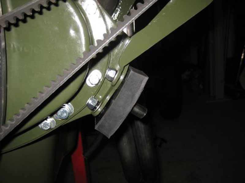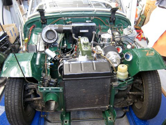 Kees has recently installed this Judson supercharger to his original 1959 Sprite which was restored in 1982. The Judson has been rebuilt by George Folchi, and is fitted to an upgraded 950 engine, with small-dish Cooper pistons, compression ratio 8.3:1, lightened connecting rods, crankshaft and flywheel, all dynamicaly balanced. It has a Kent camshaft, 12G295 head with Rimflo valves and springs, a duplex timing chain with vernier adjustable cam drive, and a Kent oil pump. It also has a free-flow Maniflow exhaust with prototype Nardi silencer, and an upgraded 1275 clutch and standard smoothcase gearbox!!! Some pictures below show the 2 supports he has constructed to take up the weight of the Judson. He says: "The support bolt onto the exhaust is already a weak detail on the standard cast iron exhaust, and is certainly not working at all on the LCB pipes! It was a lot of fiddling to get it place and No, I did not make a drawing. It is all welded from steel strip to make it stiff enough".