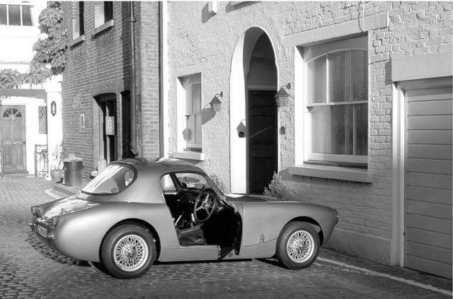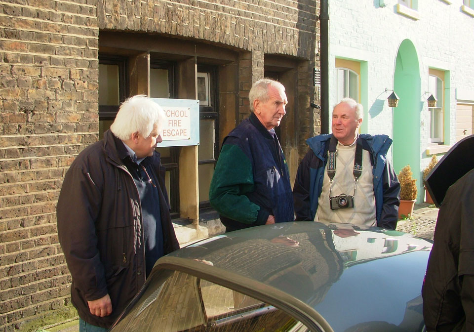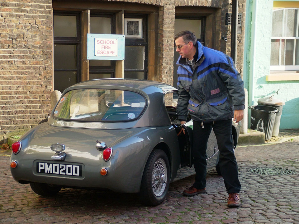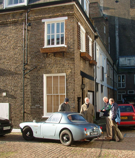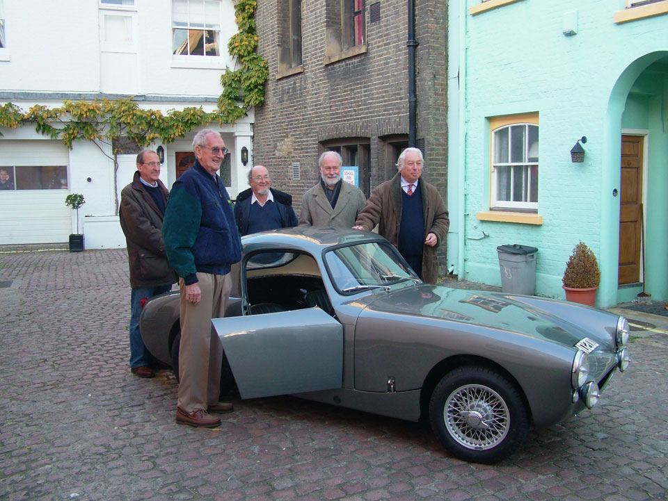 On Friday 18th November 2005, John Sprinzel was re-united with his alloy-bodied Sebring Sprite Coupé re-built after many years and again officially registered with his old registration number PMO 200. The car's new owners Paul and Sharon Woolmer had arranged for a little re-union to take place at Lancaster Mews in Paddington, London W2 where John's business operation was based in the 1960's. The car had only recently been finished after its painstaking six year rebuild. John was over in the UK with his wife Caryl on a short visit from his home in Hawaii. Part of the plan was for "Octane" magazine to carry out a photo-shoot of both John and the car following its reincarnation. The car, painted in its original silver grey, was 'on the button', as they say, and numerous trips were made around the mews to get the feel of this very lightweight and beautifully restored racing Sprite which Stirling Moss once drove in the Sebring 4 Hours. Sprinzel's former business partner, Louis Cassoni, still lives in the Mews and he generously opened his home to several of his old cohorts (plus a few interlopers like myself). Jack Wheeler who drove his own Sebring in period at Nurburgring and in the Targa Florio, was there, plus Peter Jackson former owner and racer of 46 BXN which is also now in the Woolmer stable. Another old contemporary, Peter Clarke who had owned and raced S221 for a time, was there, as was Tom Coulthard (Sprinzel's co-author of "Spritely Years"). The gathering would have been incomplete without Sprinzel's long-time navigator Willy Cave. Brian Archer tipped me off that this prestigious gathering was taking place so he and I, plus EAO's owner-restorer/Sebring historian, Jonathan Whitehouse-Bird, made up the numbers.