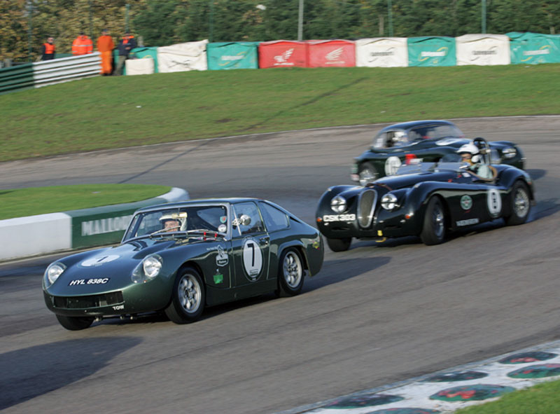and at Mallory Park, right, mixing it with the Jags.