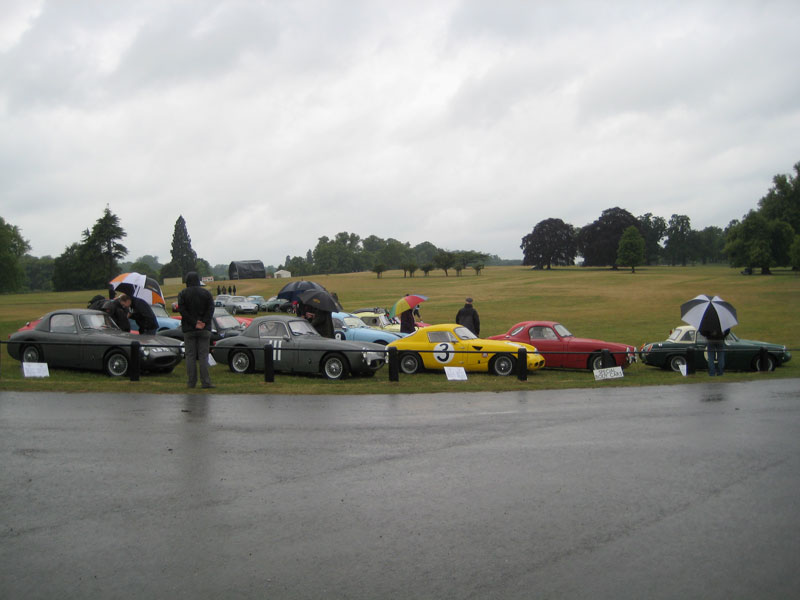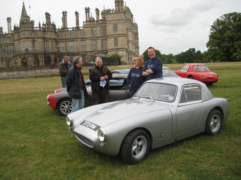 The day of this long-planned celebration of the 50 years of the MG Midget dawned sunny and bright but rain was forecast for later in the morning. Jointly organised by the MG Car Club, the MG Owners Club and the Midget & Sprite Club, the event was held in the park surrounding the stately home of Burghley House where the famous horse trials take place annually. The team had sold tickets for some 700 cars and when we arrived shortly after 8 a.m. Midgets and Sprites of all varieties were trickling in, accompanied by a few MGBs and one or two modern TFs. There had been some uncertainty as to whether we, the Sebring Replica clan, would be able to arrange our planned "clock" to display 12 cars in a circle, and of course whether twelve would actually be there. However we soon found an area close to the historic cars which were being positioned by Paul Woolmer and, with tape measure and pegs, began to set out our display. Andrew Forster had been able to borrow Richard Pugh's Fastback complete with tow car and trailer, and several others also came that way including my own Coupe, JJO. An hour or so later we reached 11 cars and I thought we were going to be one short but then Mark Turner arrived with his Coupe Mark 2 and completed the circle. Gordon Higgs' beautifully-finished red Coupe came sans engine and 'box being as yet unfinished, Derek Stewart's equally fine Fastback was there in a lovely shade of blue, and Ian Ashfield's similar car had still done only a dozen miles from new. With Michael Meerlo's Fastback driven all the way from Holland we had 4 Fastbacks and 8 Coupes. Trevor McIlroy brought his newly completed Coupe over from Northern Ireland to join those of Alan Anstead, Brian Wheeler, Roger Byford, Gordon Higgs, Jimmy Lee, Mark Turner and myself. Hot news was that Roger Byford is to take his car on the 2012 Monte Carlo Challenge accompanied by none other than Willy Cave who is now over 80 but as alert as ever. All the cars looked great and are a real tribute to the marque ~ thanks to all of you for making the big effort to be there. A lot of interest was shown in the cars and many were fascinated to see how every car was different from its neighbour whether it be in body shape, choice of engine or gearbox, colour, wheels, suspension and so on.