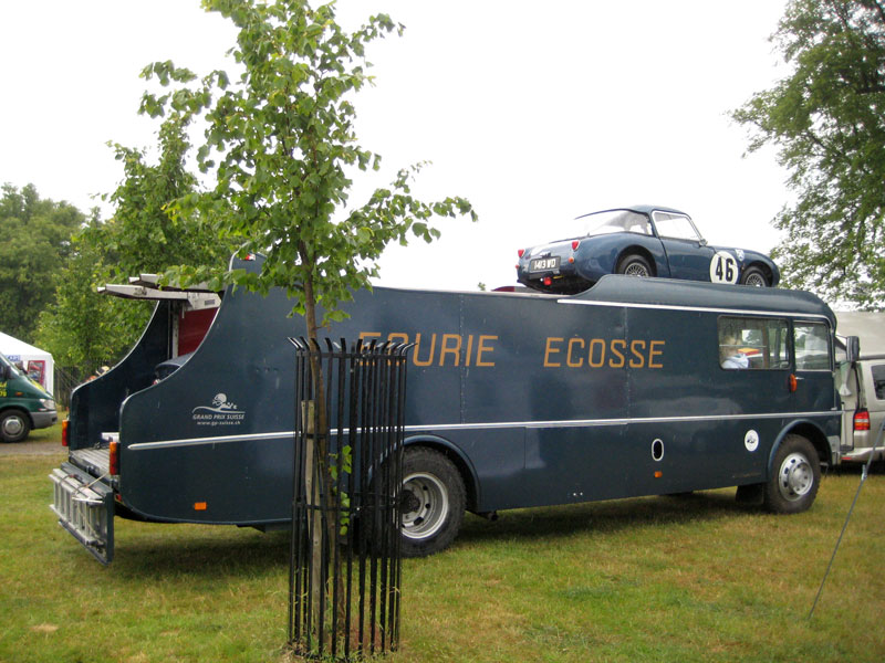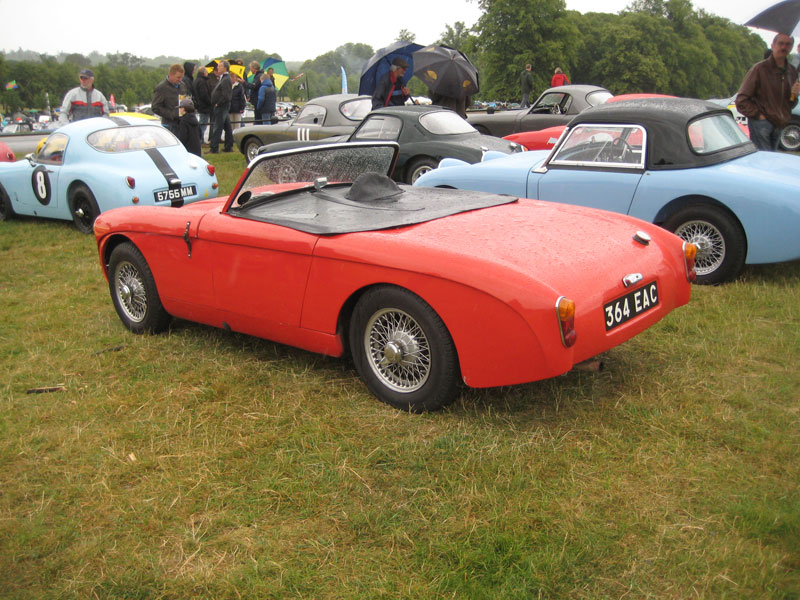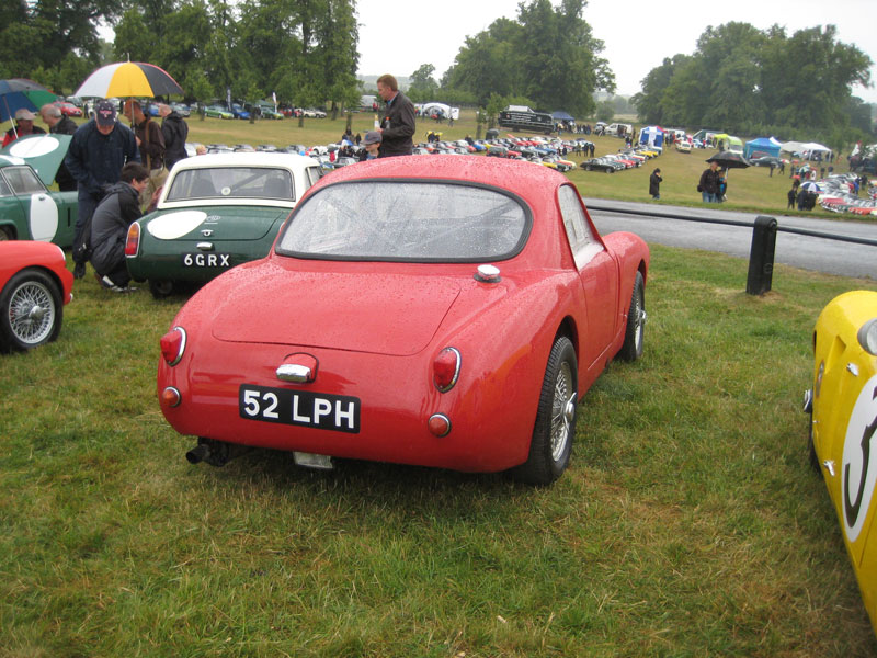 The historic cars included, of course, a Jacobs Midget belonging to Malcolm Beer, and the ex-Works 6 GRX of Dave and Nikki Saunders. Sebring Sprites: PMO, BXN, and WJB were joined by EAO which Jonathan (Whitehouse-Bird) drove to the event, the Super Sprite, Gordon Elwell's MEG, Jack Wheeler's closed version of 7080AC, Ian Grainger's s/c Frogeye, Bill McDonnough/Dave Groves' Speedwell GT and several others. Elsewhere in the field Tony Wilson-Spratt and Paul Woolmer were showing off the new Sanction II version of the WSM recently completed for Ian Hulett and the Ecurie Ecosse transporter was topped with Dick Skipworth's copy of the Le Mans Sprite. The old BMC transporter was also on show. Shaun Rainford and son had their copy of John Britten's SS1800 Lenham GT among the historics, Peter May had several of his competition cars under an awning, Motobuild brought along an Ashley-bodied Midget, the Tifosi Sebring was in evidence, and other firms were selling parts, new and old. In my wanders I bumped into Bob Kemp, the Healey Club's Sprite registrar, Larry and Dorothy Quinn who have organised the Midget Challenge for 35 years, and Tom Coulthard, Jack Wheeler, and Colin Gales, Sprite hill-climber, to name but a few.