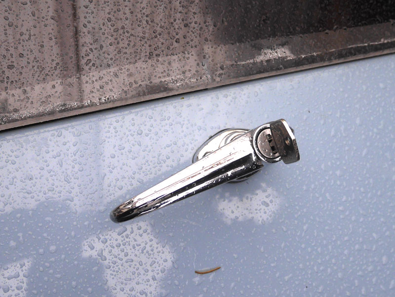 I only had thought, the frame he used for the stiffening of the thin 4mm polyacryl was a bit cumbersome and and not really required if we got a bit thicker material , believing the shape of itself and giving it four proper anchoring points on its circumference should make it very stiff, which indeed it does. I had discussed this with Andrew, who agreed with me and ordered two samples of 8 mm thickness. He mentioned somebody else being interested in the second one, I do not know who. Obviously the new material was not in the perfect shape to fit into the aperture of Archers fastback body, but Dominic Mooney, who at that time took over on my request after I realized Andrews overload, put a lot of skill and sweat into shaping and fitting it, very much to my satisfaction. Two chromeplated bootlid hinges , provided for £11.50 each by Minispares provide the fixing on the roof, a Healey boot handle the lower fixing , with or without locks. The leverage from there to the two locking plates on the lower end of the window is mostly hidden inside the body and was designed and provided by Dominic, again based on materials available (period correct ! ) from other Brit cars. Sealing is by a simple rubber foam stripe, app. 3 x 20 mms, selfadhesive.