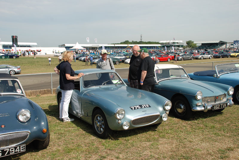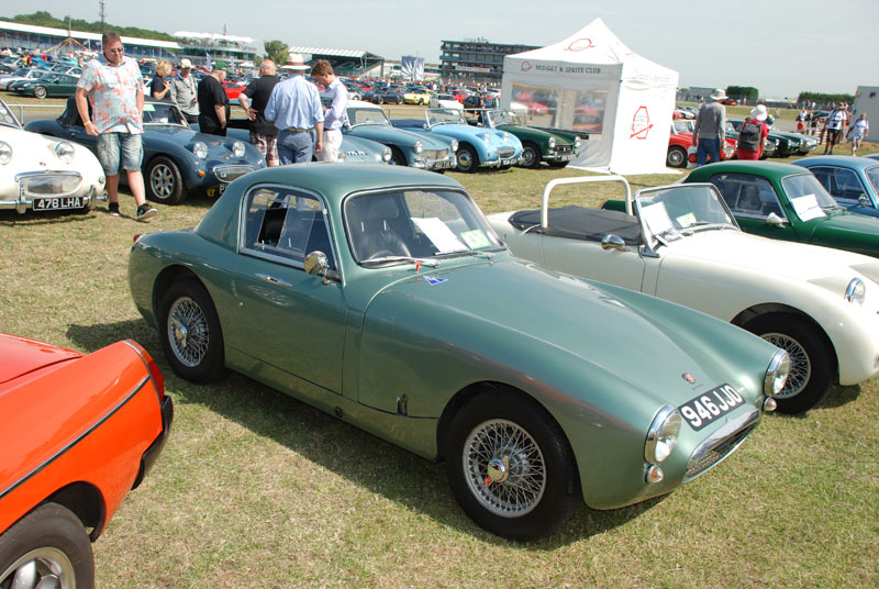 In May 1993 Brian Archer and his team at Pope Street, Birmingham, rolled out the first of their replicas of John Sprinzel's Sebring Sprite Coupé modelled on Stephen Bowen's ex-Ian Walker car, then awaiting restoration at Brian Wheeler's premises at nearby Wolvey. That first car was my own 946 JJO though in fact Country Lane Classics had put together another car a few weeks earlier using one of Brian kits - that car now owned by Andy Actman. So 20 years on and with almost 100 kits delivered, it was decided to have a little celebration. The Midget & Sprite Club generously agreed to provide some space in their display at the Silverstone Classic and 11 immaculately turned out Sebring Sprites arrived in the early morning on a scorching summer's day. Intermingled with other Sprites and Midgets I think we can say the Sebrings stole the show. Appropriately the now fully restored WJB 707 was there with owner Stephen Bowen, and his brother, to make 12 cars in all (below).