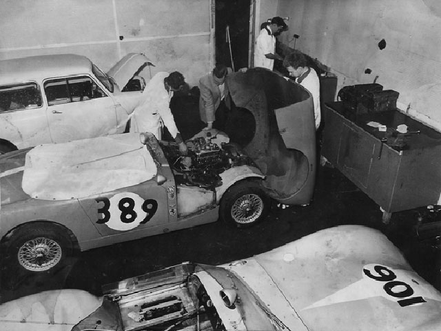 It cannot have been long after the introduction of the Sprite that Don Balm, owner of the Wild Goose Garage in Dursley, Gloucestershire and a BMC dealer, became involved in the preparation of a number of customers' Sprites taking part in rallies and speed events. The original garage had been partially demolished in 1959 and the petrol pumps moved back some 15 feet, with a raised area formed for display of used cars for sale.
