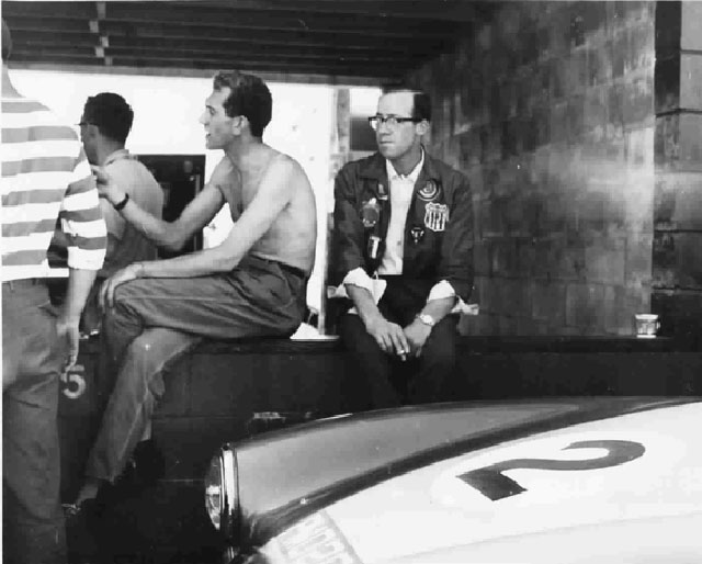 Looks like John Sprinzel pulled all his photos when he put out his book. In the new promo pics, I am standing next to him and he tells about Graham Hill in the background. Another shows him with the drivers, the same one I have shows me to the right looking at the car. The comment on one of the pictures was that cars were back from the race, but they were parked after after the clutch swap , ready to go TO the race. He said I was a NASA technician that did maintaince on the cars, but I was actually an electrical engineer with North American working on the space program. ersons that really did all he claims. A little check of BMC and Healey history will show the bare chassis were sent to the Healey factory, and Roger Menadue reworked them including fitting special bodies. The first was a kit car made using a "Falcon" body, English not American. In fact that chassis had three bodies used on it. I DO NOT know this to be a fact, but I believe BMC required the race cars to look like street cars and allowed only prototype car to run. And the street car bodies were set, so no big changes. There were some bitter feelings between the two groups. Enough of that, I have , or will make some JPEG files and send them to you but not tonight! John